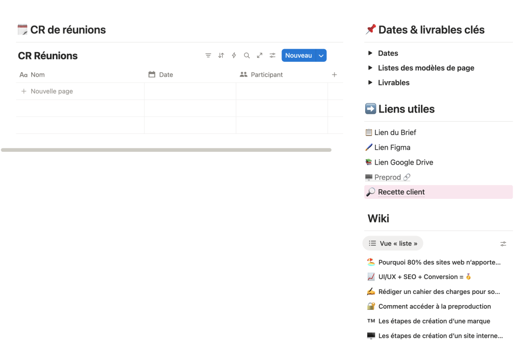 Je n’ai plus qu’à choisir le type de template (il me semble que Notion n’a pas encore automatisé ça…) et cela me crée une page vierge avec tous les éléments dont j’ai besoin pour mener à bien mon projet :
